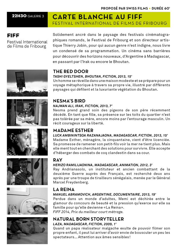 | 22H30 | Carte blanche au FIFF - Proposé par SWISS FILMS | Galerie 3 |